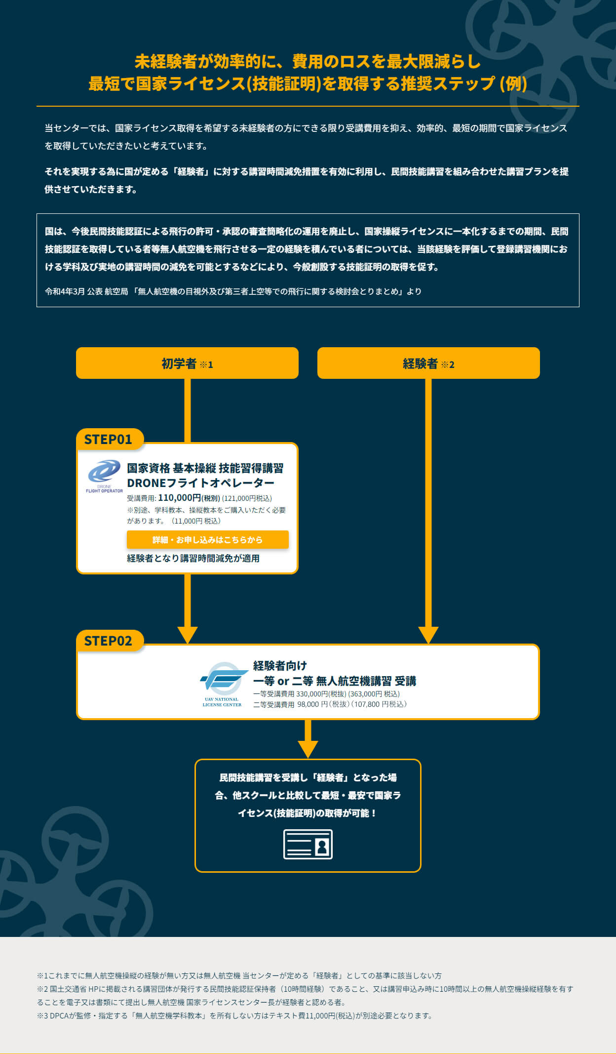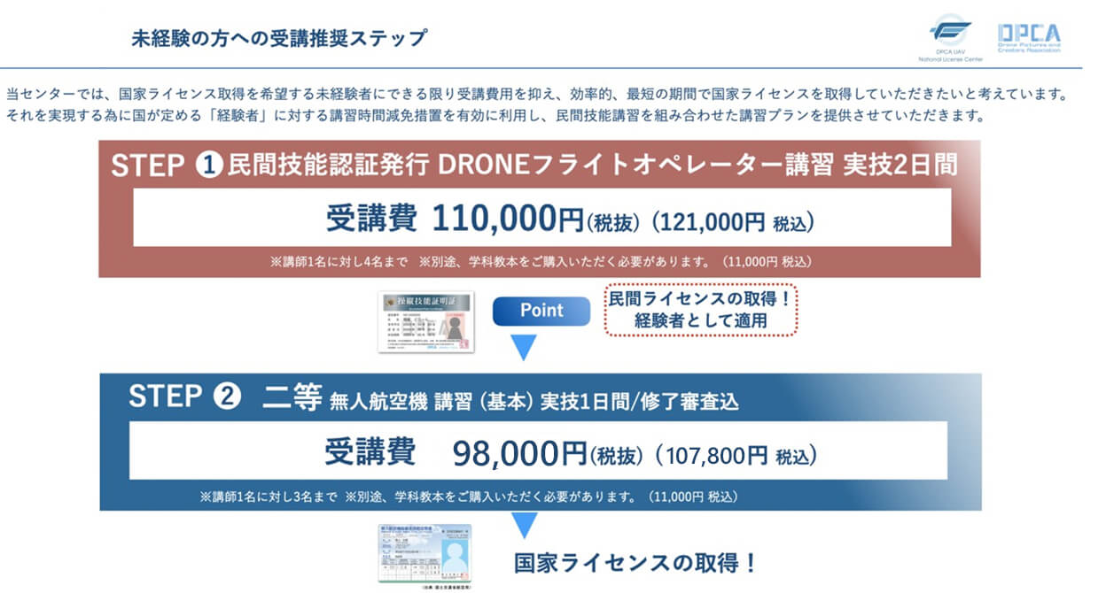 備考 ・無人航空機国家ライセンスセンターの講習となります。初学者と経験者で講習内容が異なるため、詳細についてはお問合せください。