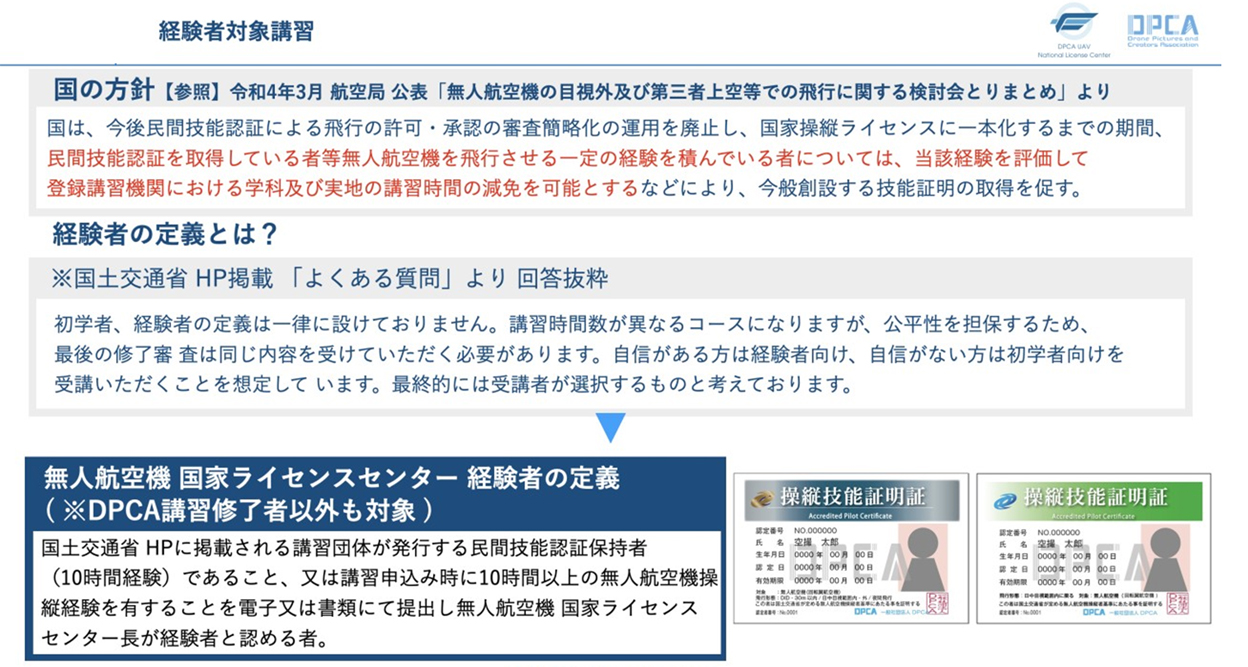 無人航空機 国家ライセンス経験者認定コース 操縦技能認証発行 DRONE フライトオペレーター講習DPCA民間ライセンス経験者認定コース